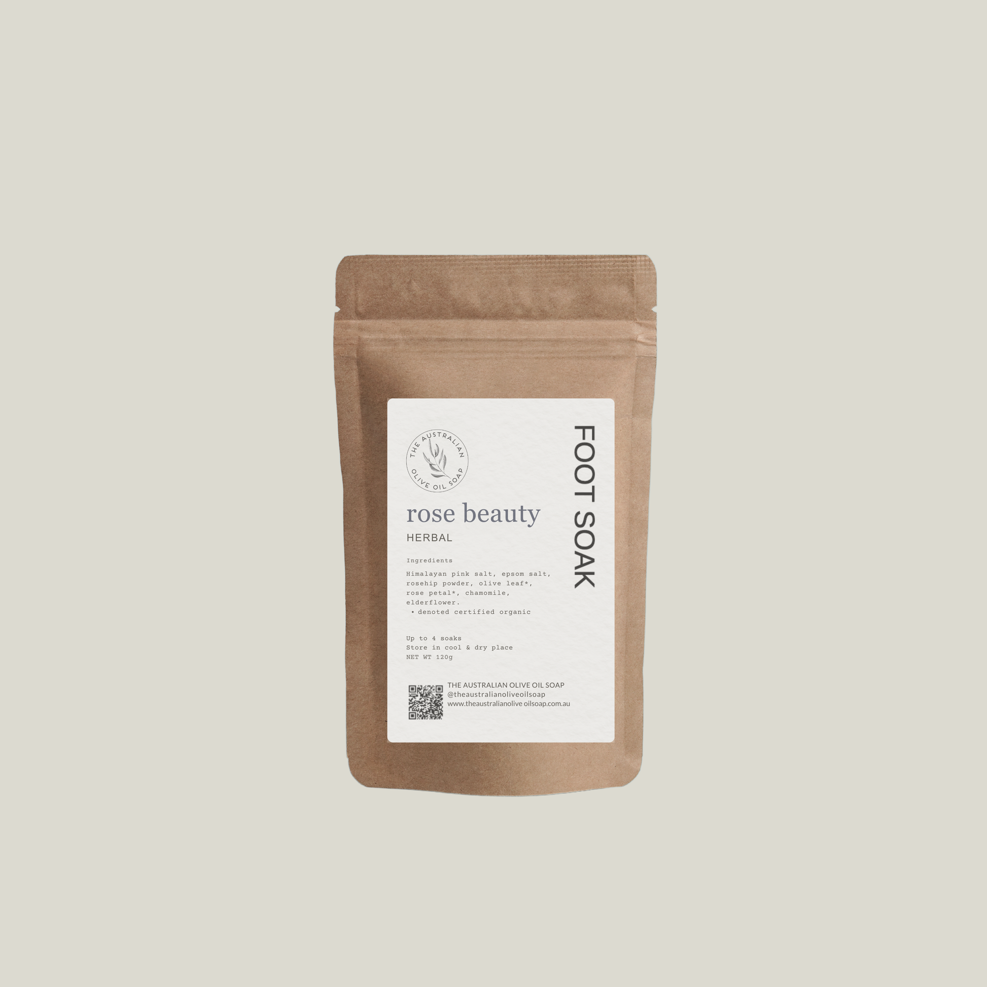 Himalayan pink salt, Epsom salt, Rosehip powder, Rosa Centifolia (Rose petals)*, Olea Europaea (Australian olive leaf)*, Matricaria Chamomilla (Chamomile)*, Sambuccus nigra (Elderflower)*. *Denotes certified organic.